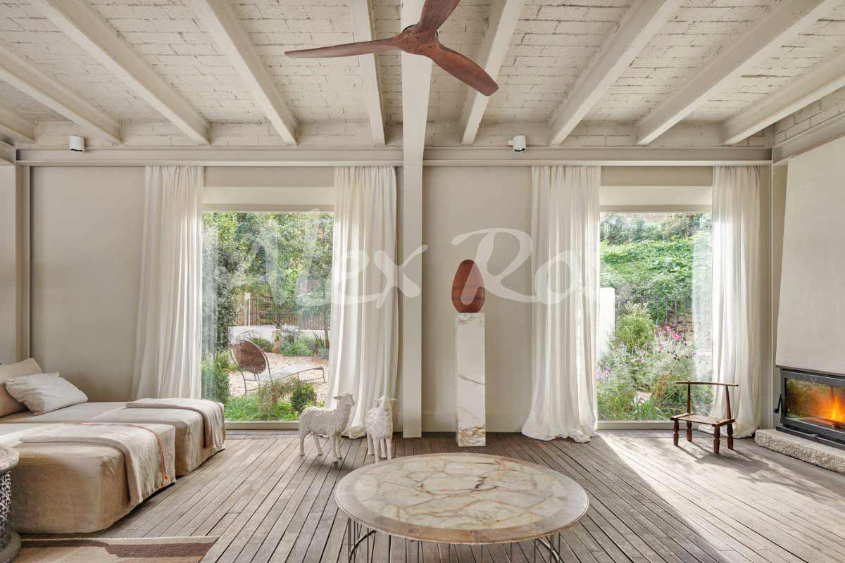 En la planta superior, la suite principal de aproximadamente 100 m² se convierte en un refugio privado, con vistas abiertas y una atmósfera serena. L’habitatge es completa amb quatre dormitoris dobles addicionals, alguns amb terrassa privada, que reforcen la sensació de casa familiar o de retir creatiu.