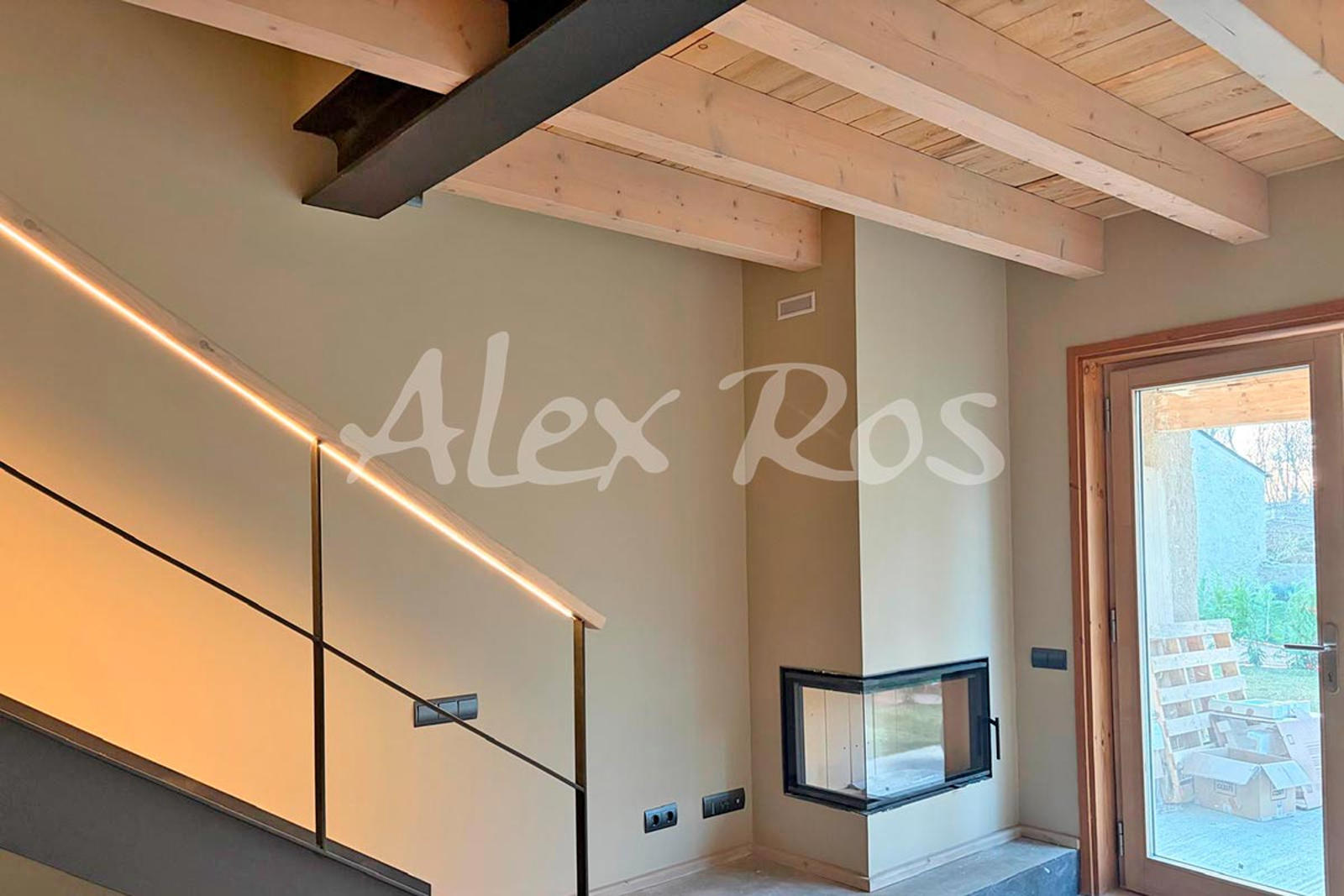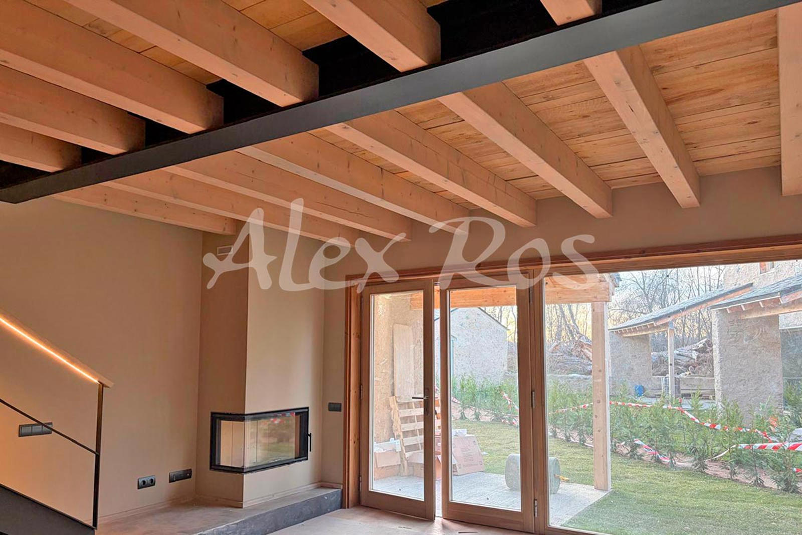 Sala d’estar menjador amb llar de foc i sortida a jardí,