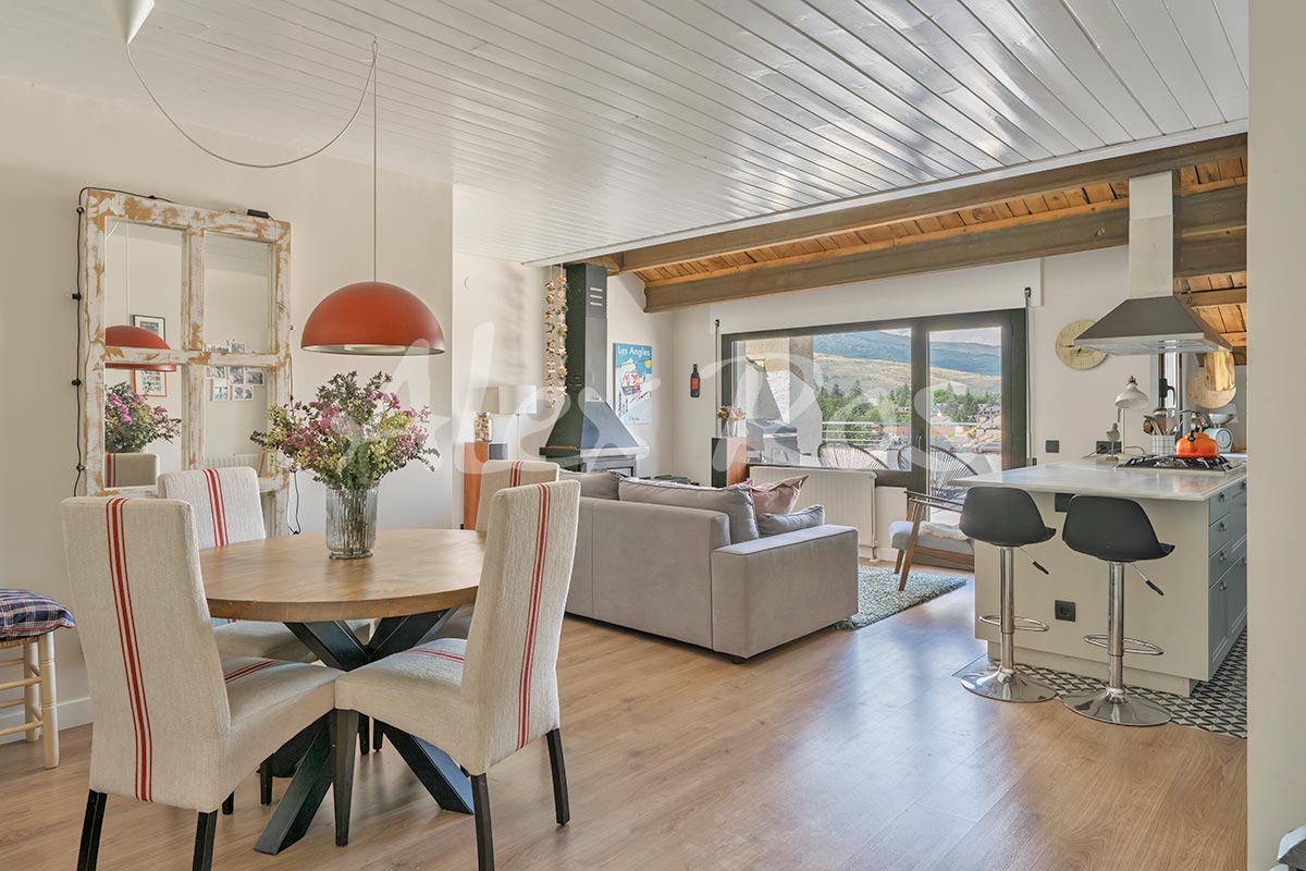 Salón comedor en una espacio diafano con cocina muy bien integrada en el espacio.