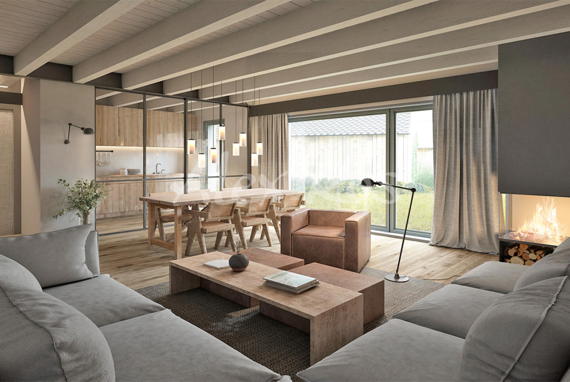 Salón comedor con chimenea y salida a jardín,