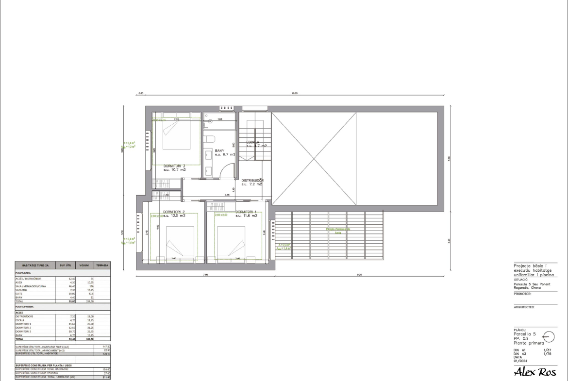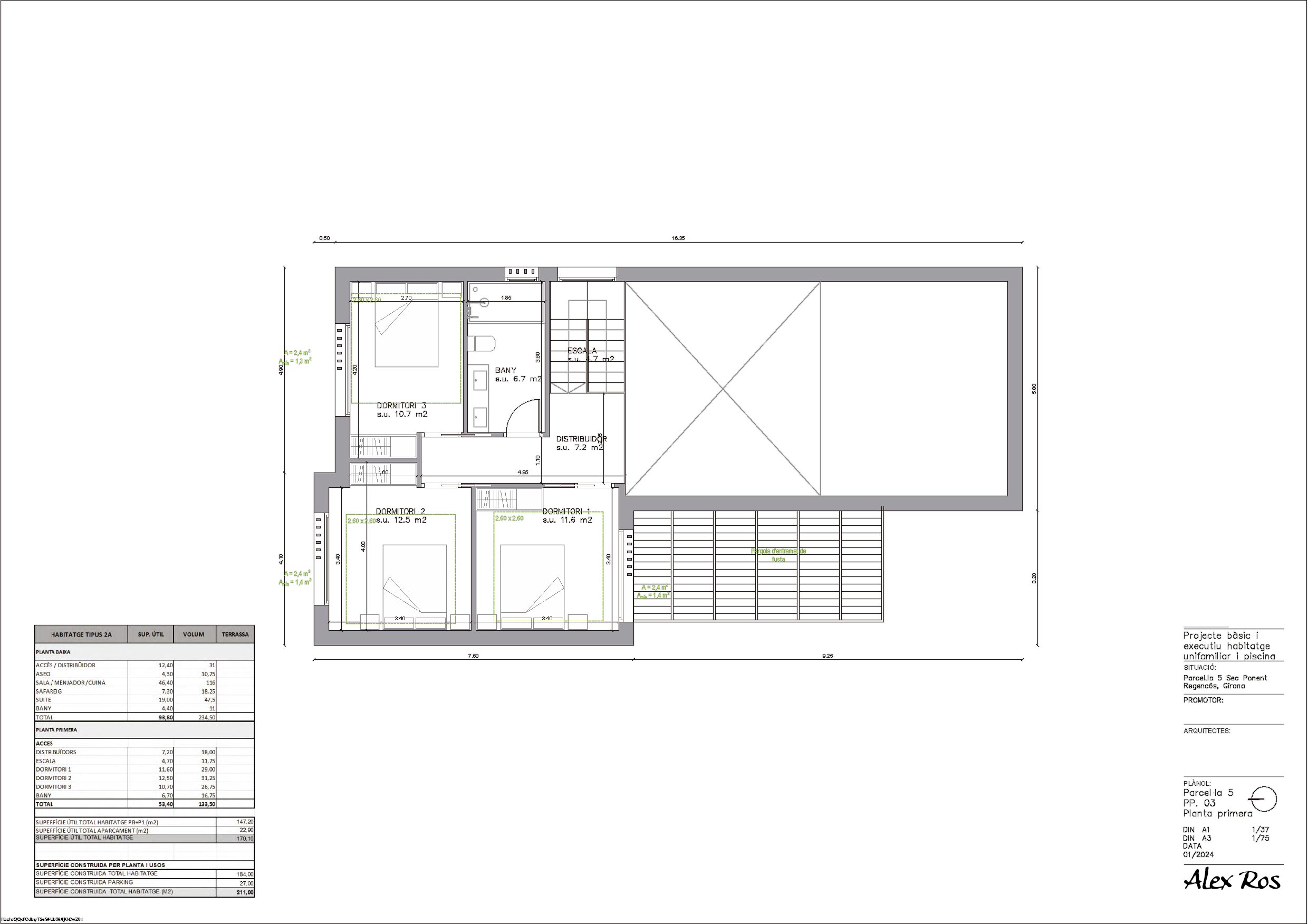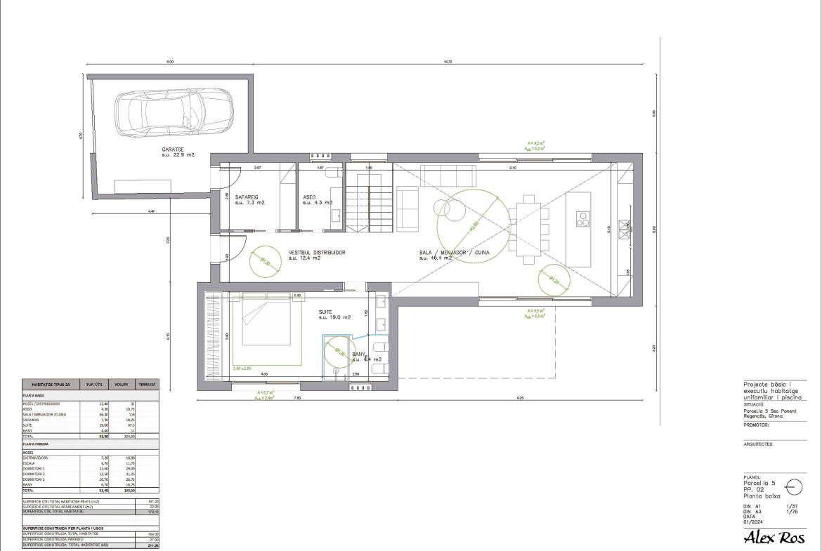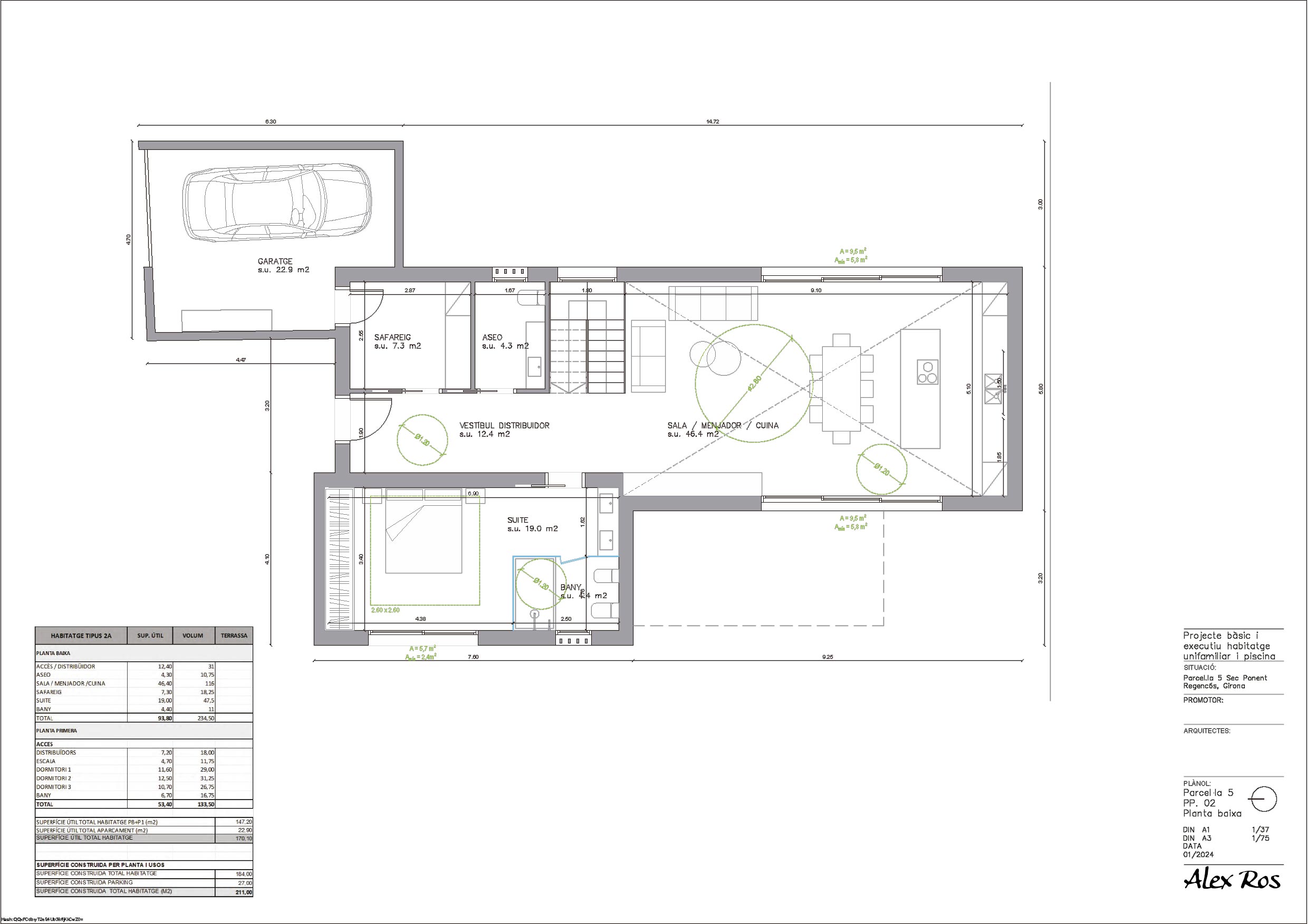 Desde la cocina/comedor podemos acceder al porche y al área de la piscina y la barbacoa exterior. En la zona del jardín se proyecta una piscina rectangular de 15,65 m² y el resto del solar que queda libre de edificación, destinándose a jardín de uso exclusivo de la vivienda.