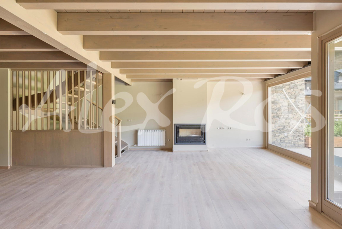 Salón comedor muy amplio con chimenea y vistas al jardín.