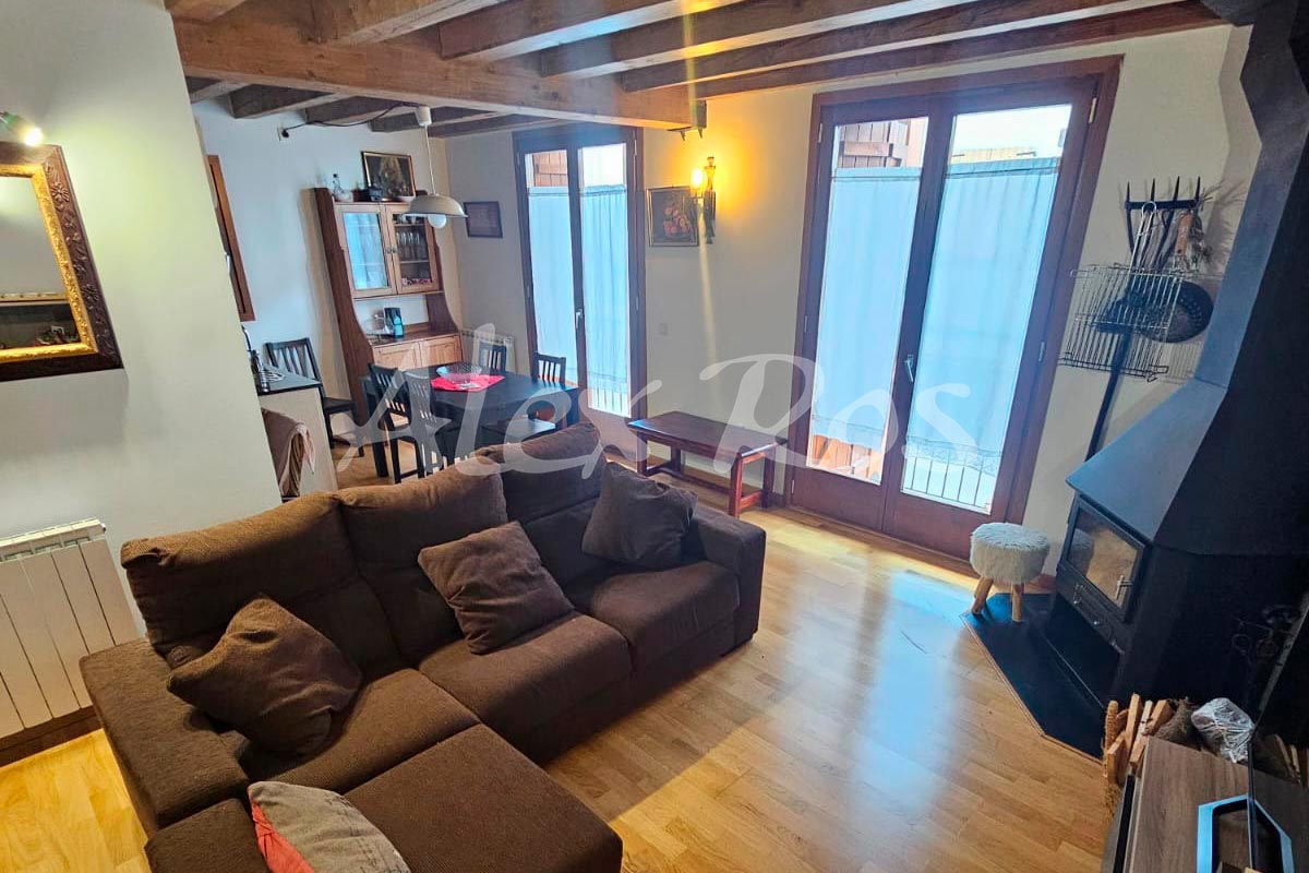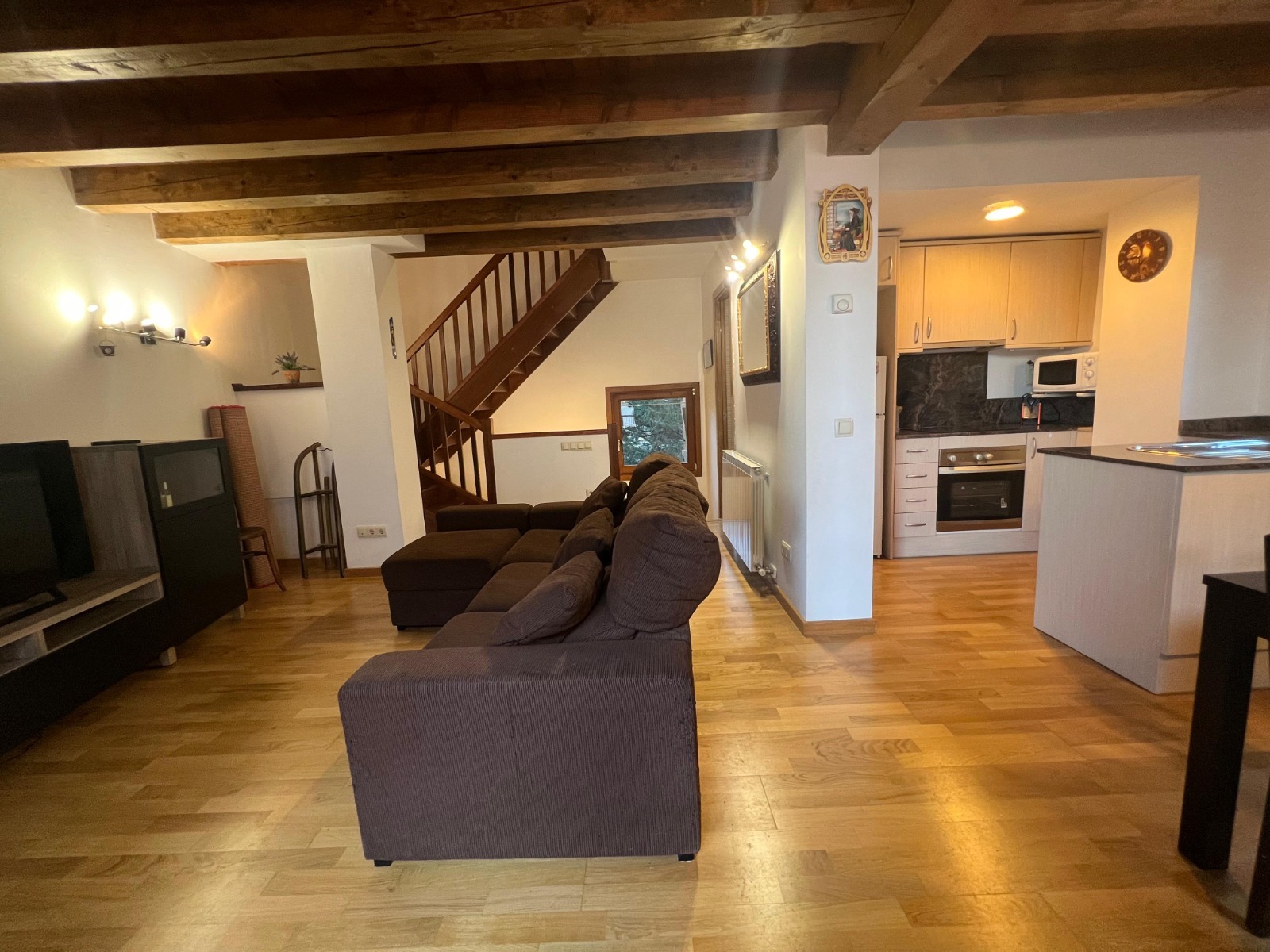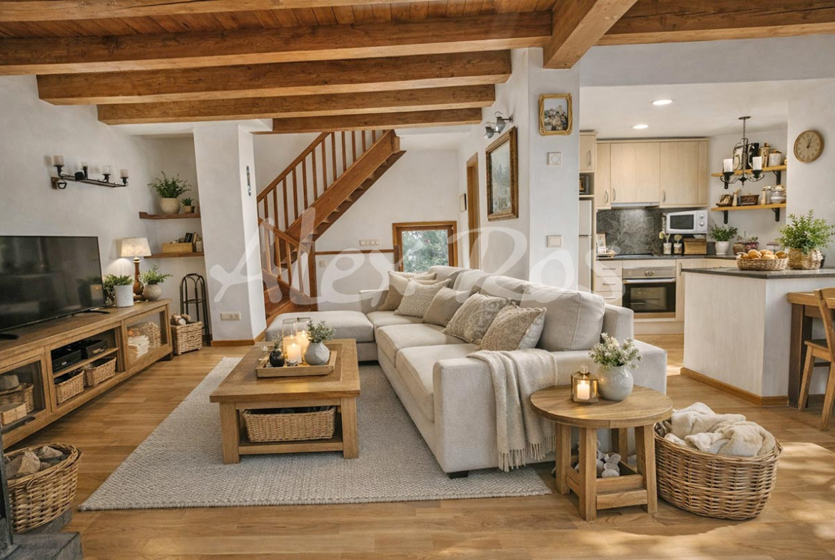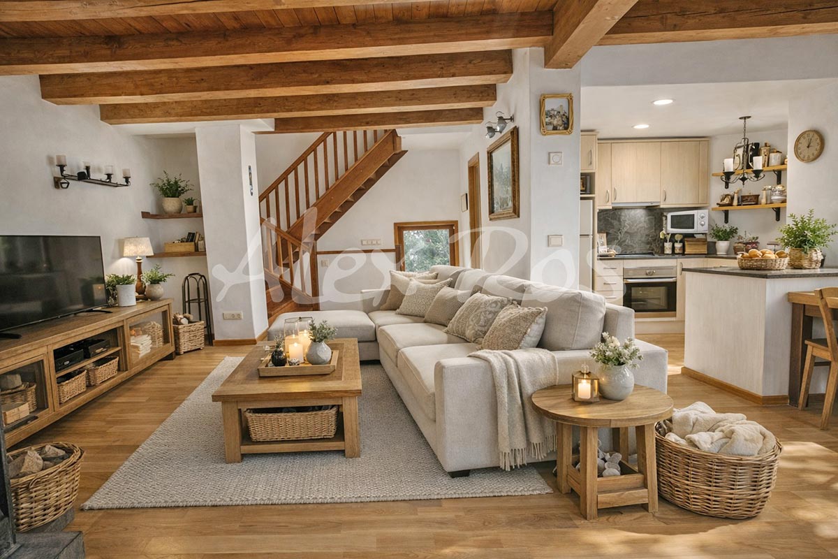 En planta: Salón con chimenea, comedor y cocina abierta tipo office, techos con vigas de madera y 1 aseo. Espacio luminoso y acogedor