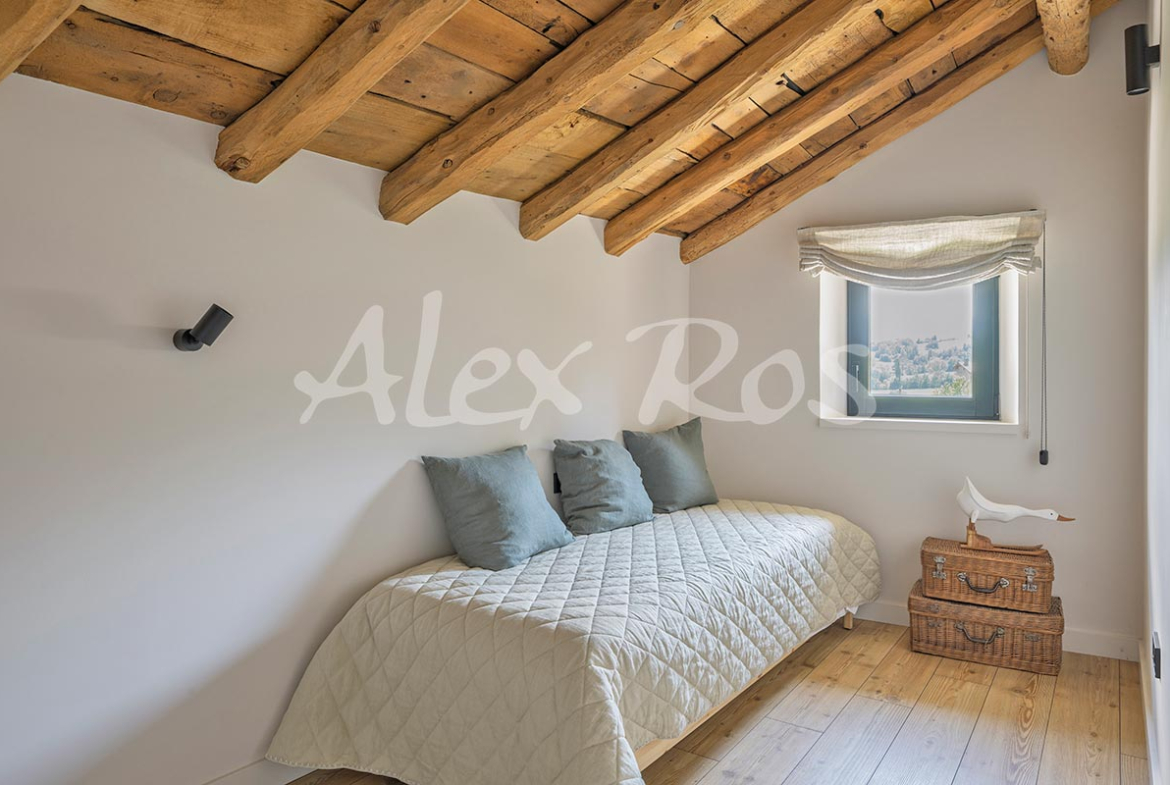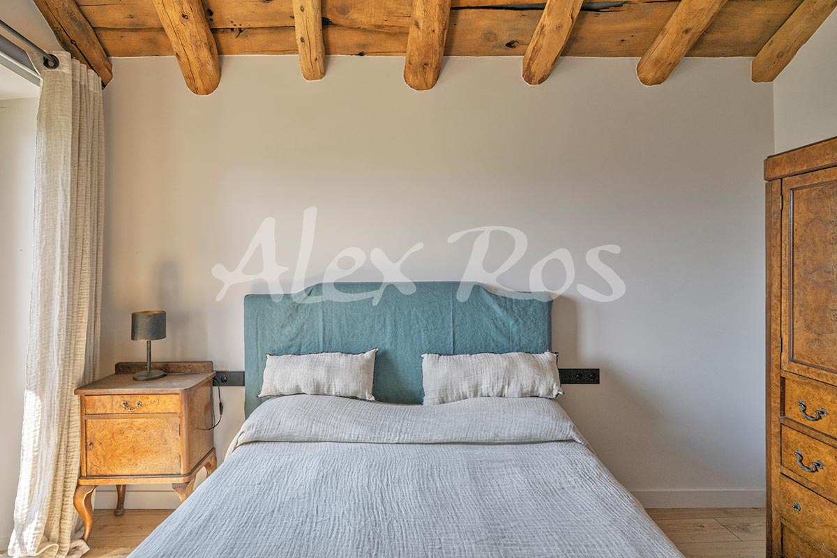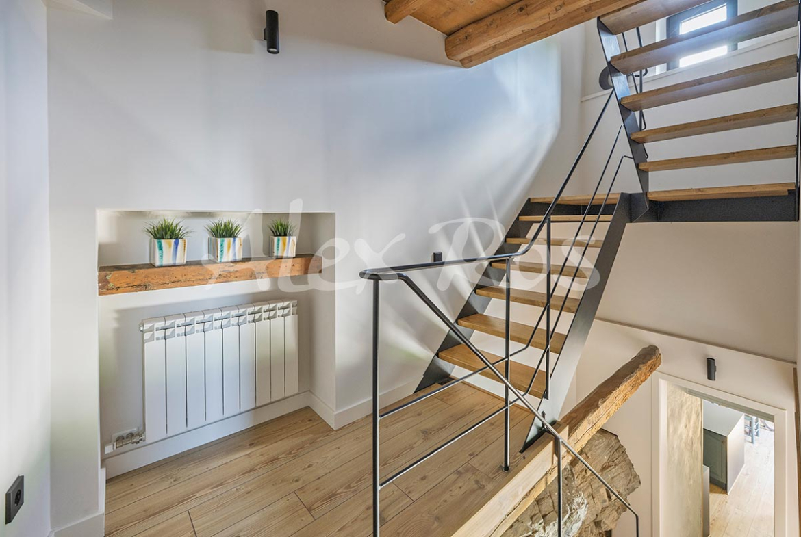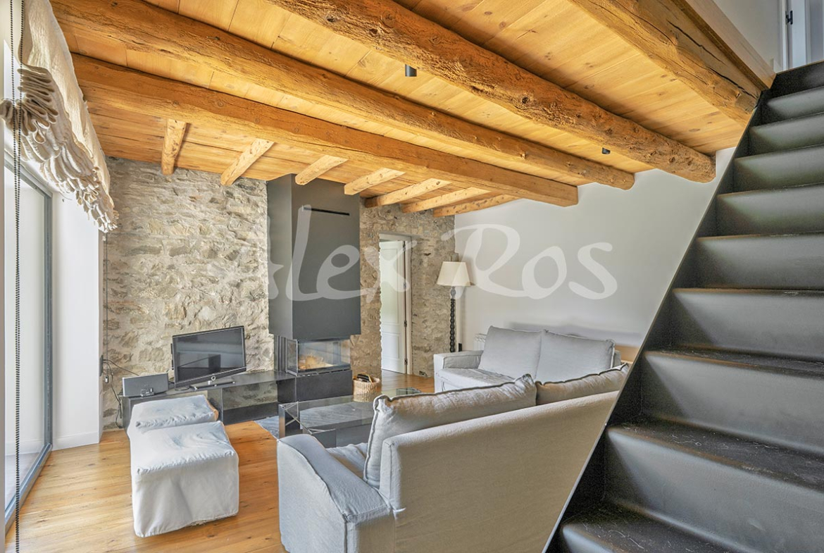 Casa que conserva las vigas típicas de madera, suelos y paredes de piedra, mezclado con elementos modernos.