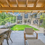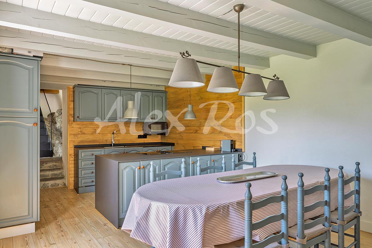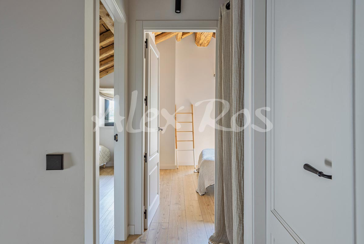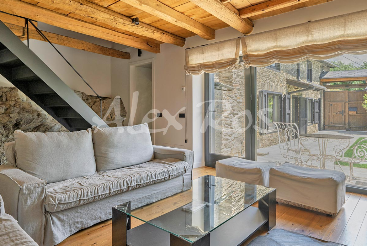 Casa que conserva las vigas típicas de madera, suelos y paredes de piedra, mezclado con elementos modernos.