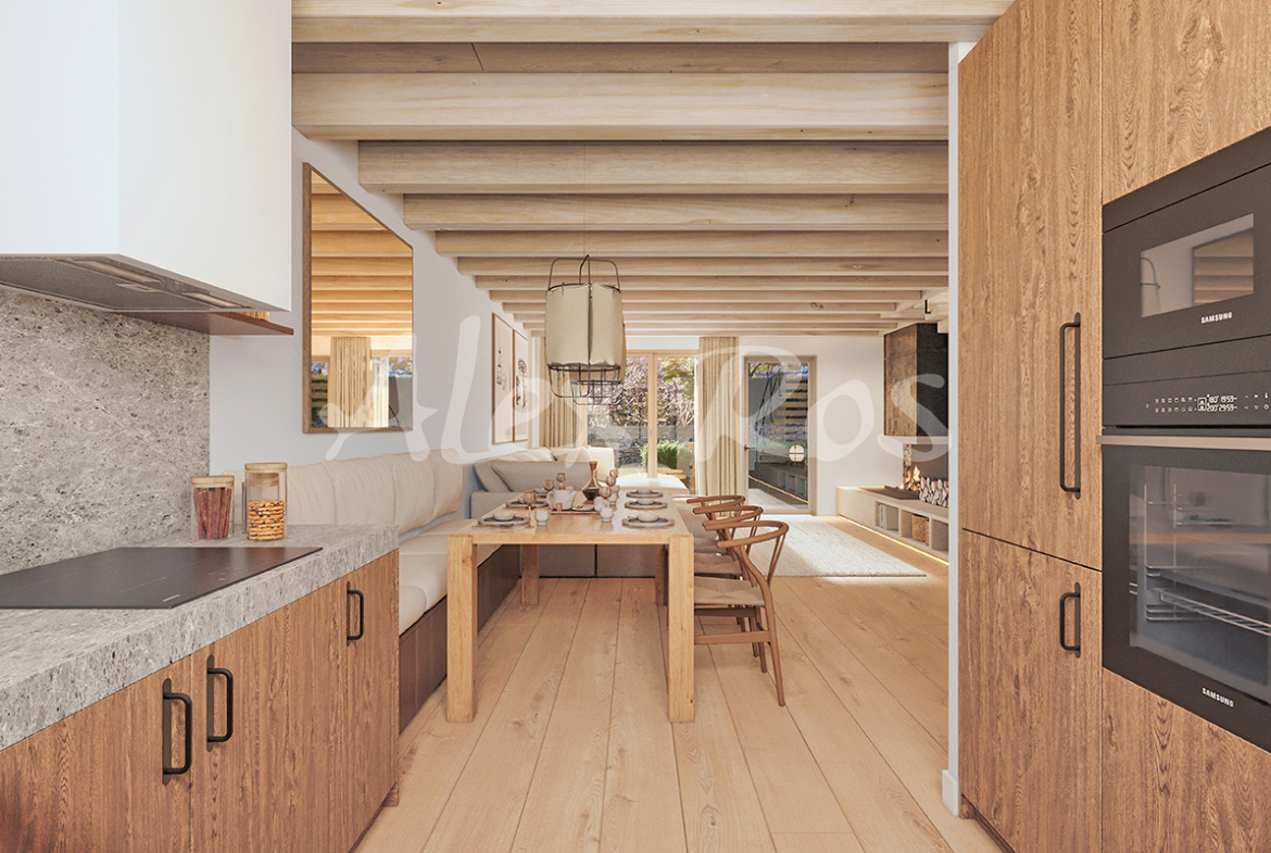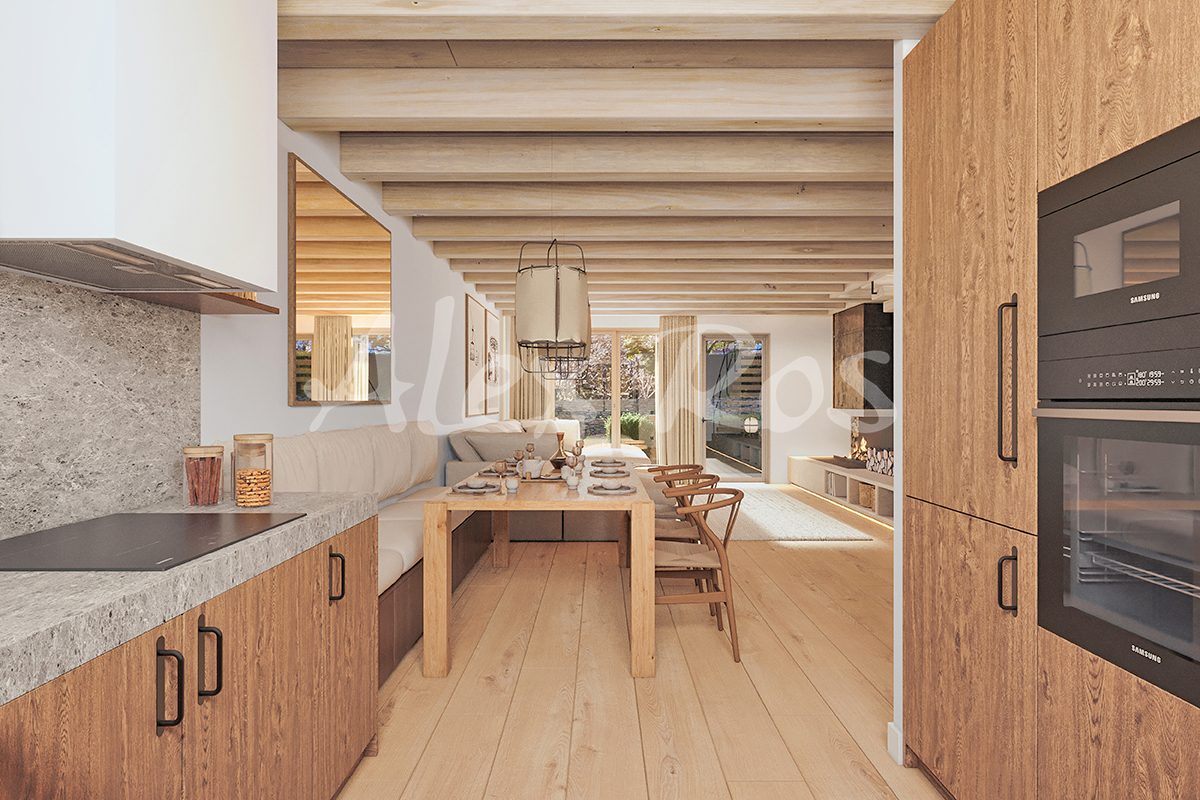En planta baja: Gran salón con chimenea, comedor con cocina abierta tipo office y aseo. Con salida directa al porche privado.